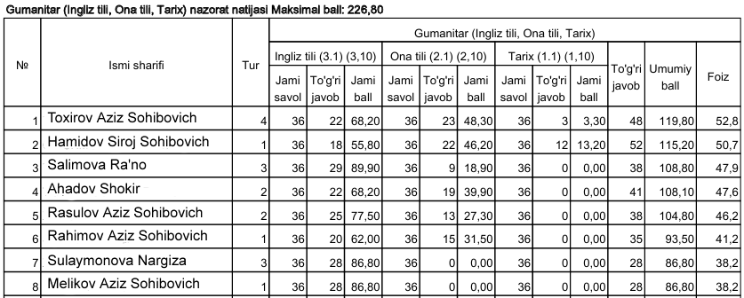 Imtihon natijalari tizimda doim saqlanadi. Ushbu natijalarni xohlagan paytda ko'rish va tahlil qilish mumkin.